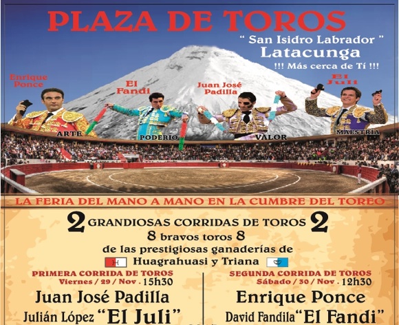 Mañana día sábado 30, con un cambio en el horario, 12:30, se lidiarán pupilos de las mismas ganaderías, al fenómeno de los rehiletes David Fandila “El Fandi”, tan espectacular que su presencia cautiva y enciende la hoguera en los tendidos, combinando disposición y facilidad para interpretar el segundo tercio con brillantes y calidad. En esta ocasión como único espada tras la lamentable caída de cartel por su reciente lesión en España y que le impide a acudir con su cita a los pies del Cotopaxi, Un auténtica pena que la afición ecuatoriana no pueda paladear en la “Chata Latacungueña”el toreo de la máxima figura, Enrique Ponce