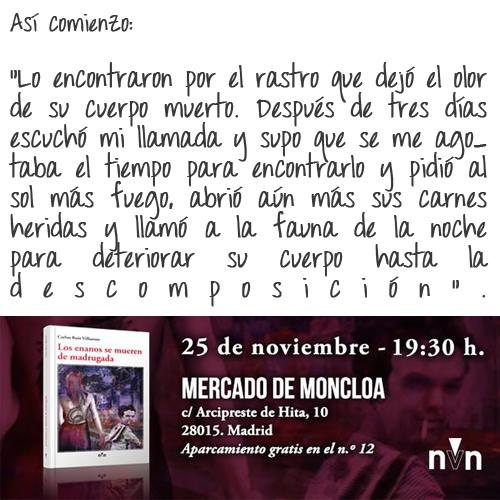 Carlos Ruiz Villasuso ha presentado en el Mercado de Moncloa de Madrid su novela «Los enanos se mueren de madrugada», pubicada por la editorial ViveLibro. El acto de presentación del libro, su primera incursión en la literatura de ficción, congregó a numerosos asistentes. Entre ellos, una nutrida representación de gente del toro: toreros como Enrique Ponce, ganaderos como Juan Pedro Domecq y Fernando Domecq, empresarios como Manuel Martínez Erice, Tomás Entero, José María Garzón y José Carlos Carreño y periodistas como Federico Arnás, Miguel Ángel Moncholi, Íñigo Crespo y la redacción de Mundotoro al completo.