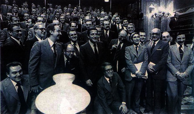 Diputados de las Cortes Constituyentes festejando la aprobación de la Carta. A Los 7 traidores que participaron en su redacción (Gabriel Cisneros, Miguel Herrero, José Pedro Pérez Llorca, Manuel Fraga, Gregorio Peces-Barba, Miquel Roca y Jordi Solé Tura), se les llamó "Los padres de la Patria."