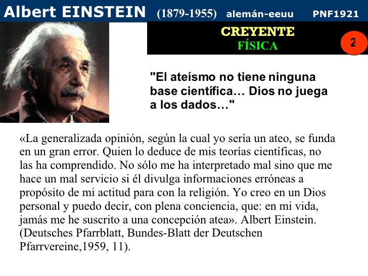 Para Albert Eisntein: "La Religión sin la Ciencia estaría ciega , la Ciencia sin la Religión estaría coja también "; “Hay dos maneras de vivir una vida: La primera es pensar que nada es un milagro. La segunda es pensar que todo es un milagro. De lo que estoy seguro es que Dios existe”; “Mientras más estudio la materia más creo en la existencia de Dios”.