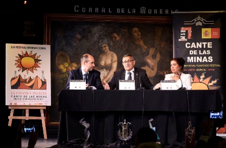 El presidente ejecutivo de la Fundación Cante de las Minas y alcalde de La Unión Pedro López Milán, acompañado de la cantaora Lole Montoya y Juan Manuél del Rey, copropietario del Corral de la Moreria, ha presentado esta mañana en el tablao flamenco madrileño, la programación de la LVII edición Festival Internacional del Cante de las Minas, que se desarrollará del 2 al 12 de agosto de 2017.