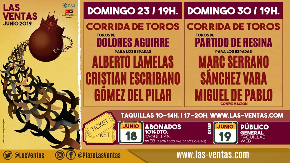 Para el domingo 30 de junio se esperan a los toros de Partido de Resina que el pasado año lidió el 12 de octubre tras ser suspendida por lluvia su tarde en San Isidro. La terna está compuesta por Marc Serrano, Sánchez Vara y Miguel de Pablo que confirma alternativa.