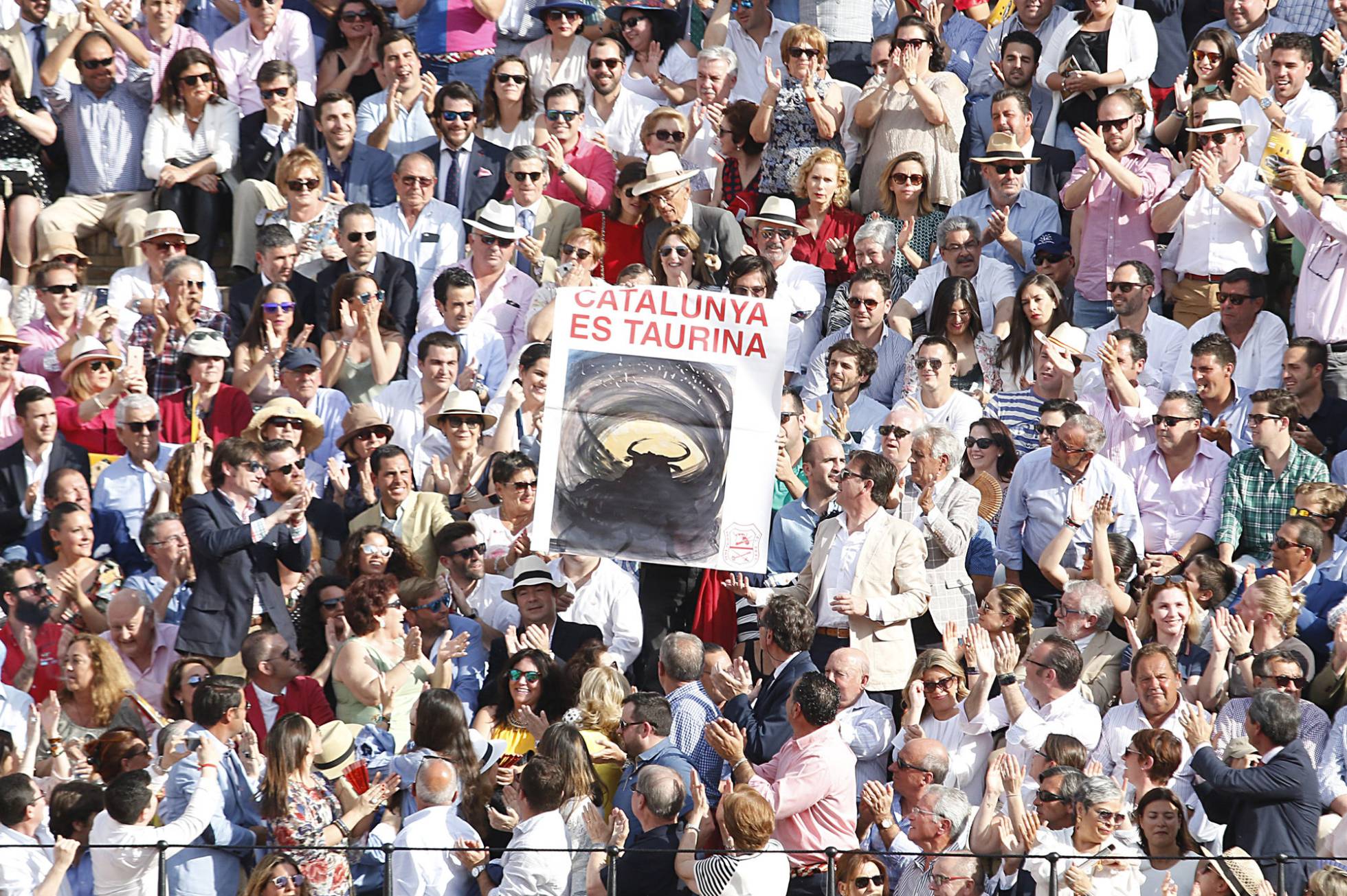 Un grupo de aficionados muestra una pancarta en la Maestranza de Sevilla. PACO PUENTES