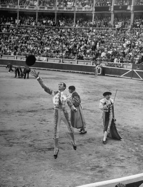 Y, más aún, cuando vimos al cordobés realizar su primer archicolosal faenón de muleta, iniciado con cinco altos impresionantes de inmovilidad y basado, seguidamente, en fabulosos e ideales series de sobrehumanos pases naturales con la izquierda, maravillosamente ligados, prodigio de temple, de ritmo, sin un movimiento forzado, sin la menor impresión de riesgo y sin embargo –al igual que sus derechazos- de una quietud sin precedentes, y las puntas de las astas pespunteando con líneas oscuras el raso del magnífico terno blanco y oro del diestro, cuando aún todavía tiraba cinco incomprensibles manoletinas, de ejecución inverosímil y de garbo único vimos a Manolete entrar, derecho, despacísimo, a fondo, magistralmente, para clavar un formidable volapié, hasta la mano y en lo más alto del morrillo, entonces pensamos haber tenido la suerte de asistir a la plasmación de una proeza extraordinaria y excepcional del famoso diestro y nos dimos por totalmente satisfechos y dispuestos a aceptar; sin murmurar; una labor facilona y sin gran esfuerzo por parte del artista en su segundo adversario ya que lo propio del MILAGRO, es, evidentemente el no poder repetirlo cada cuarto de hora…