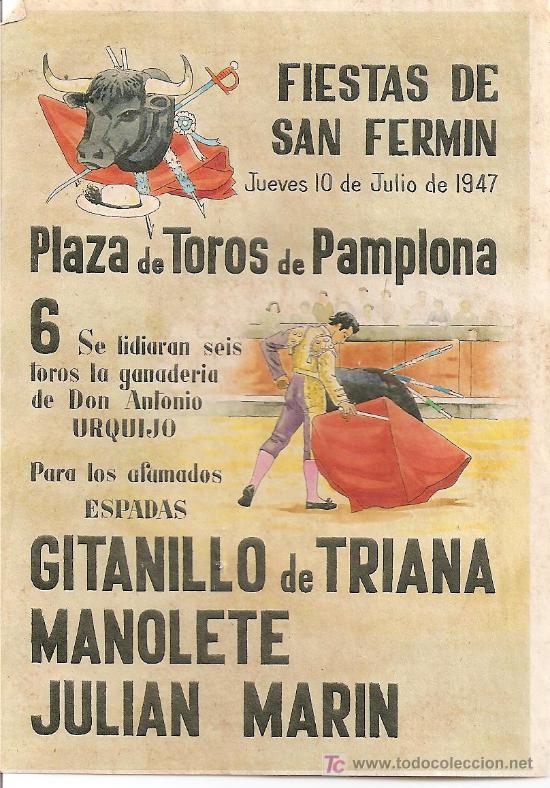Cuatro grandes corridas de toros. Manolete torea la tarde del 10 de julio. En el cartel: Gitanillo de Triana, verde y oro; Manolete, de blanco y oro y Julián Marín de cobalto y oro. Toros de don Antonio Urquijo con trapío suficiente como de costumbre en Pamplona. El triunfo del cordobés es aplastante: cuatro orejas y dos rabos.