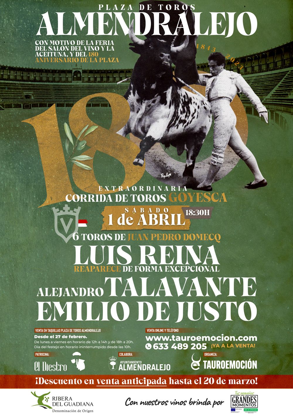 La plaza de toros de Almendralejo acogerá una corrida de toros goyesca histórica, el regreso a los ruedos de Luis Reina, junto a Alejandro Talavante y Emilio de Justo con toros de la ganadería de Juan Pedro Domecq.