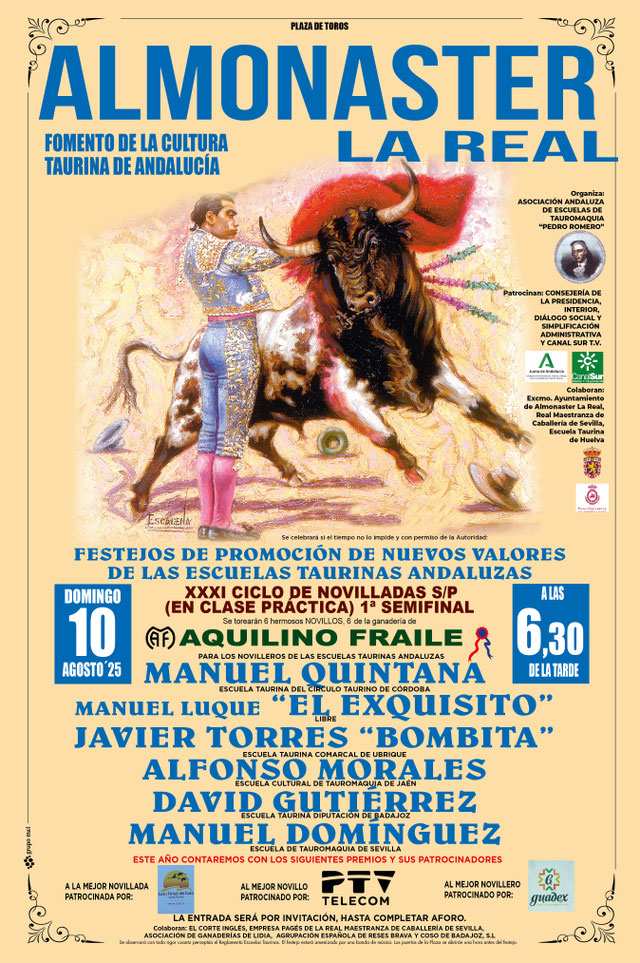 La localidad onubense de Almonaster la Real celebró el pasado domingo 10 de agosto, la “Primera Semifinal” del XXXI Ciclo de Novilladas Sin Picadores retransmitidas por Canal Sur TV, para los siguientes alumnos de escuelas taurinas: