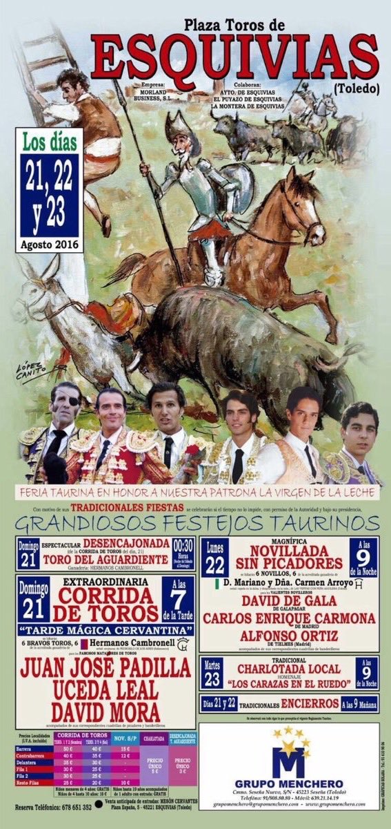 El pasado viernes 5 de agosto, a las 22,00 horas, las Peñas Taurinas "El Puyazo" y "La Montera" de Esquivias (Toledo), como parte de la organización de la Feria presentaron lo que sera el acontecimiento taurino del año en la localidad, la Corrida de Toros Cervantina que se va a celebrar el próximo día 21 de agosto de 2016, dentro de las fiestas en honor de la patrona de la localidad, la Virgen de la Leche. La presentación tuvo lugar en el patio de la Casa de Cervantes de Esquivias.