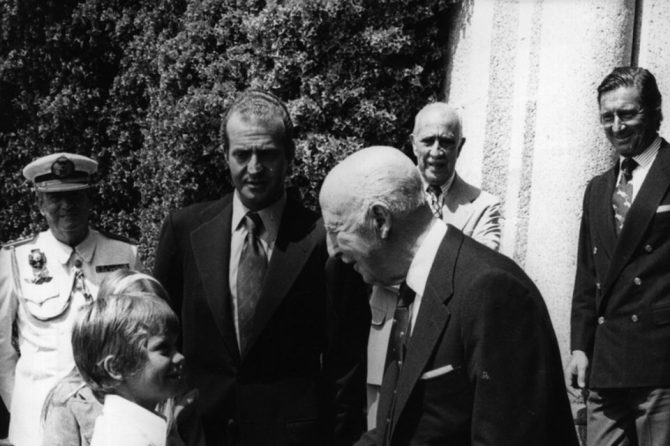 Franco saluda al hoy rey Felipe VI. Al fondo, Juan Carlos I, observa la escena.