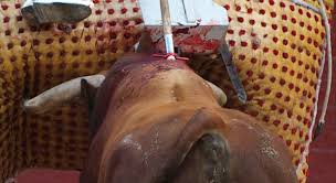 Por otra parte la sangre que pierde el toro como consecuencia de los puyazos es relativamente muy poca (4-5 litros y el toro tiene 37.5 litros)como para corregir una congestión, y menos aun el corte en la oreja que es un cartílago y sangra muy poco. Puede asegurarse que con ese corte en la oreja la vaca puede perder 8-10 mililitros de sangre, menos de lo que se saca a una persona (que solo tiene 5 litros) para hacerle un análisis. Por tanto ni la vaca ni el toro están congestionados, ni el sangrarles mejora nada, sino al contrario. La sangre que pierde el toro como consecuencia de los puyazos, en el 95 % de los casos, puede contribuir a atemperar algo la embestida del toro, a que sea algo menos violenta, pero es el cansancio del esfuerzo que hace el toro atacando y moviendo el caballo primero, y luego embistiendo a la muleta lo que más le cansa , lo que más le atempera en su embestida. No obstante puede ocurrir que en algún caso los puyazos rompan arterias muy importantes y el toro sangre más de lo habitual, con lo que la pérdida de sangre exceda ampliamente de los 4-5 litros que suele perder, en cuyo caso la tensión arterial del toro bajaría mucho, lo que expresa parándose más, siendo más tardo y acometiendo con menos energía.