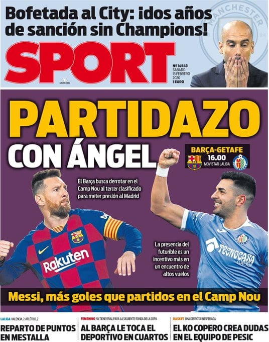 En Barcelona, mientras tanto, un sí pero no a esta noticia. Foto, eso sí, de Guardiola en ambas portadas. Pep vale para todo. Al que le suele valer cualquier cosa en su portada es a 'Sport', que hoy tira por el morbo y la desestabilización. Llevan a Ángel a la primera página casi más por su posible futuro en el Camp Nou que por las virtudes que pueden hacer que sea un arma a tener en cuenta esta misma tarde. Los periódicos cataculés son unos maestros en el noble arte de hablar de lo que a nadie interesa con tal de agitar las aguas y ver si hay ganancia de pescadores. Pobre Getafe, la verdad. Pasen ustedes un estupendo sábado.