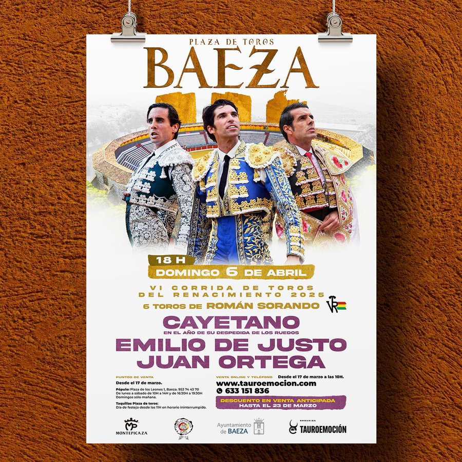Baeza se viste de gala este domingo para la celebración de la VI Corrida del Renacimiento de la localidad jienense. Una corrida que se ha situado como todo un acontecimiento en la provincia de Jaén por su importancia y su contexto. Cayetano, Emilio de Justo y Juan Ortega, con los toros de Román Sorando. Un cartelazo.