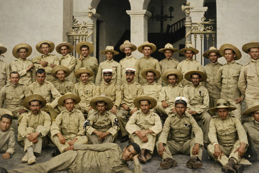 Los últimos de Filipinas reales en una foto histórica restaurada digitalmente. Solo la lectura de «El Imparcial» les convenció de que la guerra había terminado. Foto: MD.